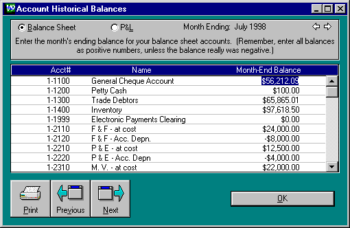 If you wish, you can enter historical balances for your accounts. This enables you to compare this year's accounts to last year's accounts without waiting a year for M.Y.O.B. to collect comparative data. The balances you will enter are the pre-conversion balances for your accounts.Click on the History button. The following window will be displayed.