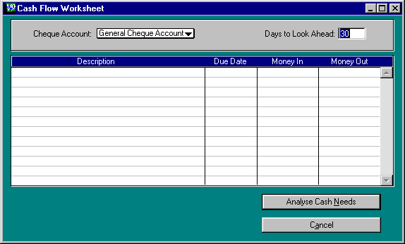 Click on the MYOB Analyst function of the Chequebook Analyst. The Cash Flow Worksheet window appears.