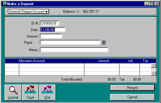 Click on the Chequebook command centre and on the Make a Deposit function. The Make a Deposit window will be displayed.