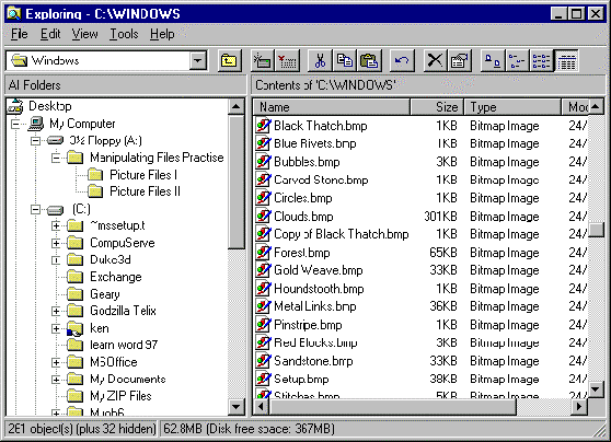 We want to copy all the picture files (type Bitmap, extension .bmp) into the Picture Files I folder from the Windows folder on the hard disk. To do this we display the file(s) to be copied in the Files pane of Windows explorer, and the folder they are to be copied to in the Folders pane.