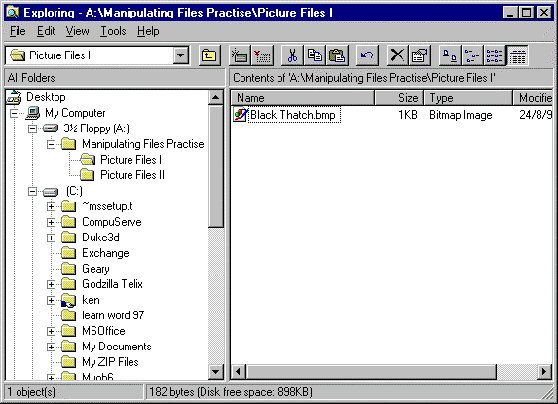 - In the Folders pane, click on the folder name Picture Files I to open that folder in the Files pane. This should display the previously copied file, Black Thatch.bmp