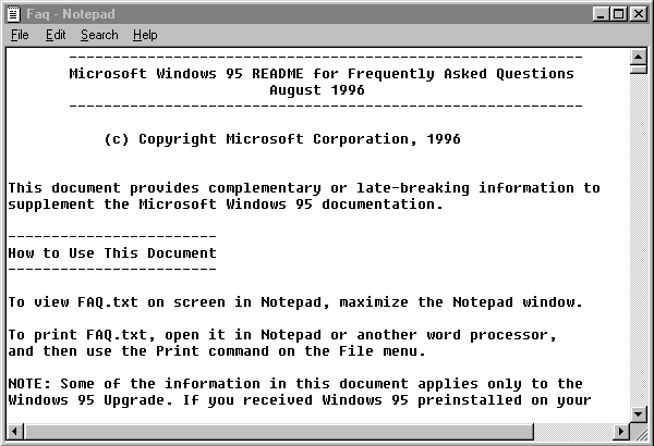 - Double click on the shortcut. You will be looking at a file titled Microsoft Windows 95 Readme for Frequently Asked Questions. The file will be opened in Notepad.