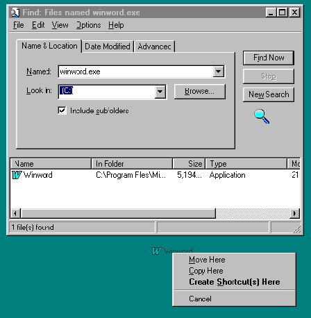 The file Winword.exe will be displayed at the bottom of the Find window.