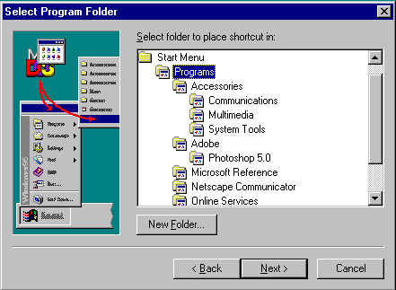 You click on the folder that has the same name as the menu you want the program to appear in. We are putting the Paint program into the Programs menu.