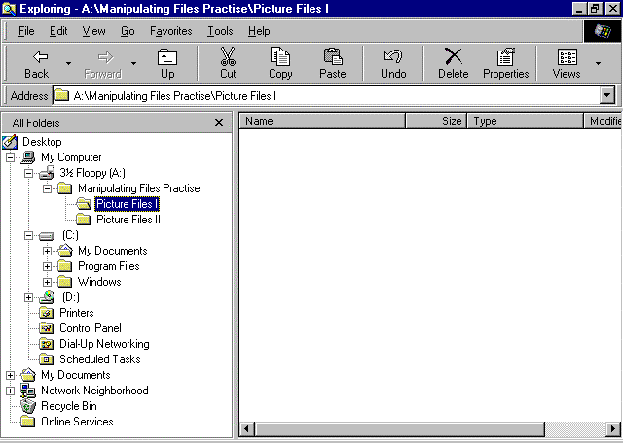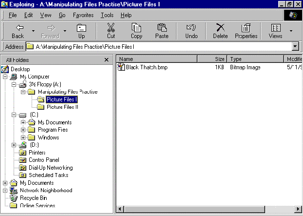 We want to copy all the picture files (type Bitmap, extension .bmp) into the Picture Files I folder from the Windows folder on the hard disk. To do this we display the file(s) to be copied in the Files pane of Windows explorer, and the folder they are to be copied to in the Folders pane.