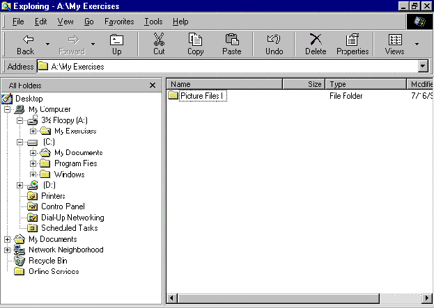 Notice that a plus sign has appeared next to the floppy disk drive icon in the Folders pane. Click on this plus sign to display the folder My Exercises in the Folders pane.