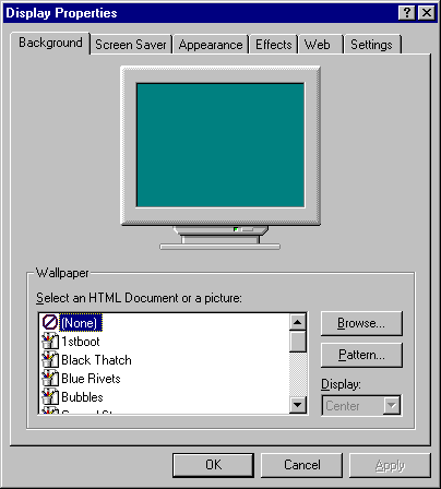 - Click on the Background tab. This is where you change the pattern on your desktop.