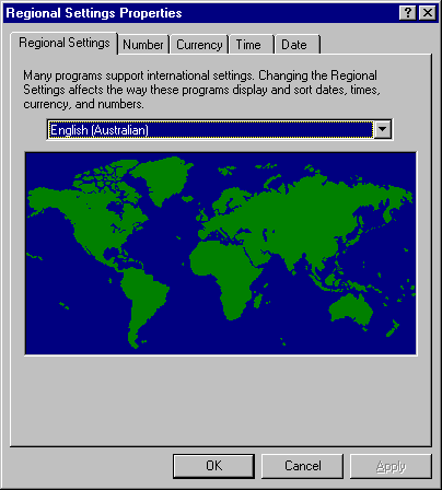 The Regional Settings tab is where you choose the language that you want to use. The date, time, number and currency formats for Windows NT and your application programs will be taken from this language.