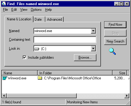 The file Winword.exe will be displayed at the bottom of the Find window.