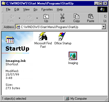 The next step is to set up the Imaging shortcut so it runs in a window on the desktop when Windows 98 first starts up.