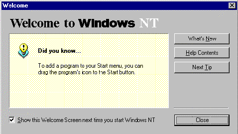 The Welcome window is a quick way to see tips about Windows NT or access the Help files. The buttons on the right of the window give a variety of actions you can perform.