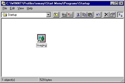The next step is to set up the Imaging shortcut so it runs in a window on the desktop when Windows 95 first starts up.