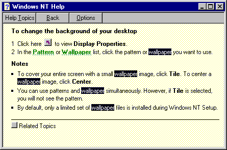 - The third field shows a list of help topics for the selected word. Double click on the topic To Change the Background of Your Desktop to display it.
