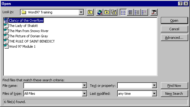 - Look at the folder in the Look In field. It is Word97 training. When you open a file in Word97, the folder that appears in the dialog box is the last folder you opened a file from.